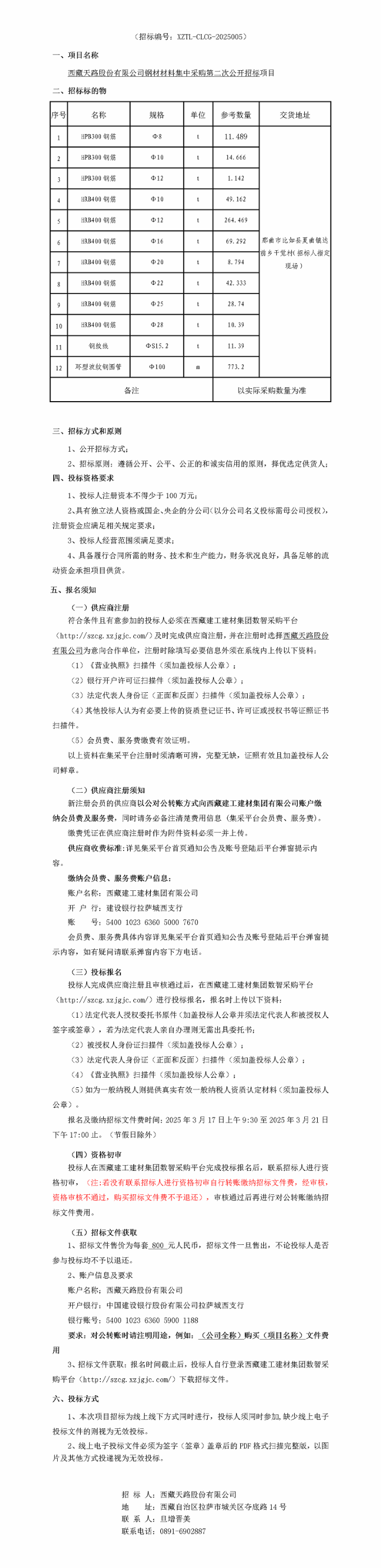 (招標編號:XZTL-CLCG-2025006) 一、項目名稱     西藏天路股份有限公司鋼筋材料集中采購公開招標項目 二、招標標的物 序號 名稱 規(guī)格 單位 參考數(shù)量 交貨地址 1 鋼筋HRB400E Φ6 T 2 西藏自治區(qū) 那曲市市內(nèi) 2 鋼筋HRB400E Φ8 T 4 3 鋼筋HRB400E Φ10 T 3 4 鋼筋HRB400E Φ12 T 12 5 鋼筋HRB400E Φ14 T 12 6 鋼筋HRB400E Φ16 T 12 7 鋼筋HRB400E Φ18 T 12 8 圓鋼HPB300 Φ8 T 240 合計 297 備注 以實際采購數(shù)量為準   三、招標方式和原則        1、公開招標方式;        2、招標原則:遵循公開、公平、公正的和誠實信用的原則,擇優(yōu)選定供貨人; 四、投標資格要求        1、投標人注冊資本不得少于100萬元;        2、具有獨立法人資格或國企、央企的分公司(以分公司名義投標需母公司授權(quán)),注冊資金應滿足相關(guān)規(guī)定要求;        3、投標人經(jīng)營范圍須滿足要求;        4、具備履行合同所需的財務、技術(shù)和生產(chǎn)能力,財務狀況良好,具備足夠的流動資金承擔項目供貨。 五、報名須知        (一)供應商注冊(已注冊成功的可直接登錄平臺投標報名)        符合條件且有意參加的投標人必須在西藏建工建材集團數(shù)智采購平臺(http://szcg.xzjgjc.com/)及時完成供應商注冊,并在注冊時選擇西藏天路股份有限公司為意向合作單位,注冊時除填寫必要信息外須在系統(tǒng)內(nèi)上傳以下資料:        (1)《營業(yè)執(zhí)照》掃描件(須加蓋投標人公章);        (2)銀行開戶許可證掃描件(須加蓋投標人公章);        (3)法定代表人身份證(正面和反面)掃描件(須加蓋投標人公章);        (4)其他投標人認為有必要上傳的資質(zhì)登記證書、許可證或授權(quán)書等證照證書掃描件。        以上資料在集采平臺注冊時須清晰可辨,完整無缺,證照有效且加蓋投標人公司鮮章。        (二)供應商注冊須知        愿意加入西藏建工建材集團數(shù)智采購平臺供應商庫并且有意愿投標的的企業(yè),需繳納平臺會員費及服務費,各供應商繳費時務必備注清楚繳費信息 (集采平臺會員費、服務費)與繳費單位信息,注冊時在相應位置上傳繳費憑證以及相應資審文件成為新供應商。        供應商入駐平臺收費標準及繳費賬戶信息:具體內(nèi)容詳見集采平臺首頁通知公告及平臺彈窗提示。        賬戶名稱:西藏建工建材集團有限公司        開 戶 行:建設銀行拉薩城西支行        賬  號:5400 1023 6360 5000 7670        (三)投標報名        投標人完成供應商注冊且審核通過后,在西藏建工建材集團數(shù)智采購平臺(http://szcg.xzjgjc.com/)進行投標報名,報名時上傳以下資料:        (1)法定代表人授權(quán)委托書原件(加蓋投標人公章并須法定代表人和被授權(quán)人簽字或簽章),若為法定代表人親自辦理則無需出具委托書;        (2)被授權(quán)人身份證掃描件(須加蓋投標人公章);        (3)法定代表人身份證(正面和反面)掃描件(須加蓋投標人公章);        (4)《營業(yè)執(zhí)照》掃描件(須加蓋投標人公章);        (5)如為一般納稅人則提供真實有效一般納稅人資質(zhì)認定材料(須加蓋投標人公章)。        報名及繳納招標文件費時間:2025年3月28日上午9:30至2025年4月3日下午17:30止。(節(jié)假日除外)        (四)資格初審        投標人在西藏建工建材集團數(shù)智采購平臺完成投標報名后,聯(lián)系招標人進行資格初審,(注:若沒有聯(lián)系招標人進行資格初審自行轉(zhuǎn)賬繳納招標文件費,經(jīng)審核,資格審核不通過,購買招標文件費不予退還),審核通過后再進行對公轉(zhuǎn)賬繳納招標文件費用。        (五)招標文件獲取        招標文件售價為每套 400 元人民幣,招標文件一旦售出,不論投標人是否參與投標均不予以退還。        賬戶信息及要求        賬戶名稱;西藏天路股份有限公司        開戶銀行:中國建設銀行股份有限公司拉薩城西支行        銀行賬號:54001023636059001188        要求:對公轉(zhuǎn)賬時請注明用途,例如:(公司全稱)購買(項目名稱)文件費用         3、招標文件獲?。簣竺麜r間截止后,投標人自行登錄西藏建工建材集團數(shù)智采購平臺(http://szcg.xzjgjc.com/)下載招標文件。        六、投標方式        1、本次項目招標為線上線下方式同時進行,投標人須同時參加,缺少線上電子投標文件的則視為無效投標。        2、線上電子投標文件必須為簽字蓋章后的PDF格式掃描完整版,以圖片及其他方式投遞視為無效投標。            招 標 人:西藏天路股份有限公司        地    址:西藏自治區(qū)拉薩市城關(guān)區(qū)奪底路14號        聯(lián) 系 人:成 鳳        聯(lián)系電話:0891-6902887