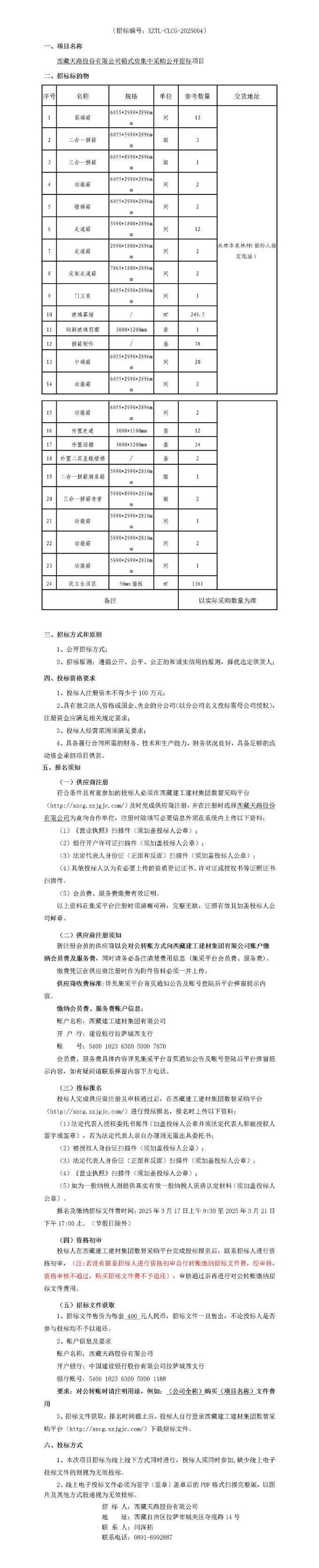 西藏天路股份有限公司箱式房集中采購公開招標公告